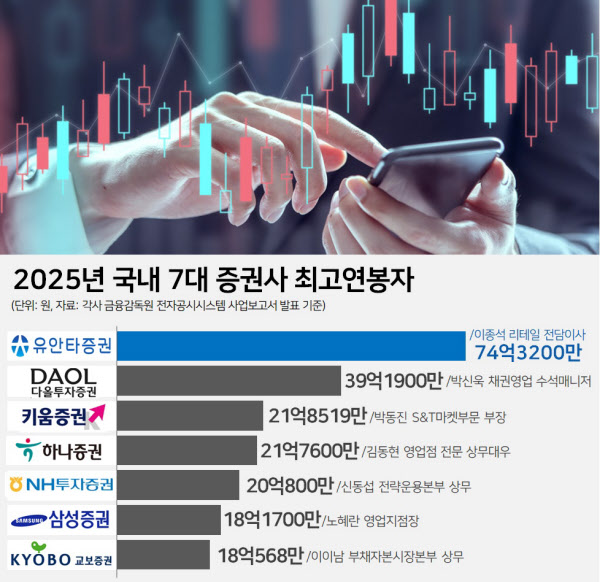 땅집고가 지난 17일 금융감독원에 공개한 국내 7대 핵심 증권사 사업보고서에 공개된 2025년도 최고 연봉 임직원을 순서대로 정리해봤다. 대부분 영업 측면에서 두각을 나타내며 수십억원대 성과급을 챙겼다는 공통점이 있었다.