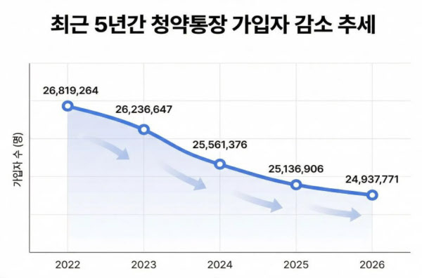 실제 청약통장 가입자는 빠르게 줄고 있다. 한국부동산원에 따르면 전체 가입자는 2024년 1월 2697만여 명에서 올해 1월 2613만여 명으로 약 84만 명 감소했다. 특히 가점이 낮은 젊은층의 이탈이 두드러진다.