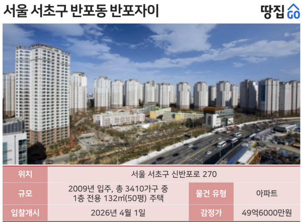 [땅집고] 서울 서초구 반포동 ‘반포자이’ 아파트 50평형이 감정가 49억6000만원에 경매로 나왔다. 현재 시세보다 17억원 이상 저렴해 벌써부터 입찰 경쟁이 치열할 것이란 관측이 나온다.