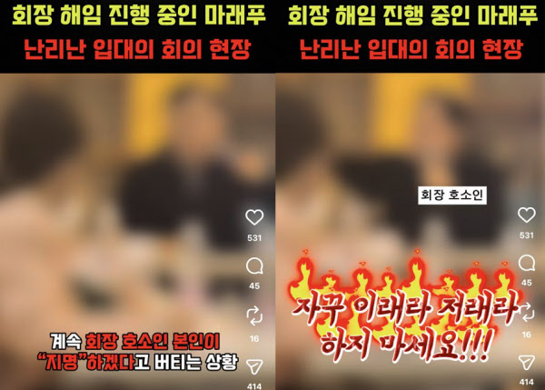 현장에서는 고성이 오가고 마이크를 빼앗는 등 극심한 혼란이 벌어졌다. 회장은 회의 도중 자리를 박차고 나가며 “잘 해쳐 먹어라”는 발언을 남긴 것으로 전해졌다. 입주민 A씨는 “동대표 모두에게 후보 기회를 줘야 하는데 특정 인사를 지명하려고 회의를 막고 있다”고 말했다.