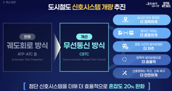 시는 최첨단 무선통신기반 열차제어시스템(CBTC)을 도입해 혼잡도를 평균 20% 이상 줄일 계획이다. 현재 국내 대다수 노선에서 사용하는 ‘궤도회로 방식’은 선로에 전기 신호를 흘려 구간 단위로 위치를 파악하므로 배차 간격을 좁히는 데 한계가 있었다. 시는 새 시스템은 열차와 관제실이 실시간 통신하며 위치를 정밀하게 파악해 안전거리를 유동적으로 조절함으로써 열차 간격을 획기적으로 줄일 수 있다고 설명했다.