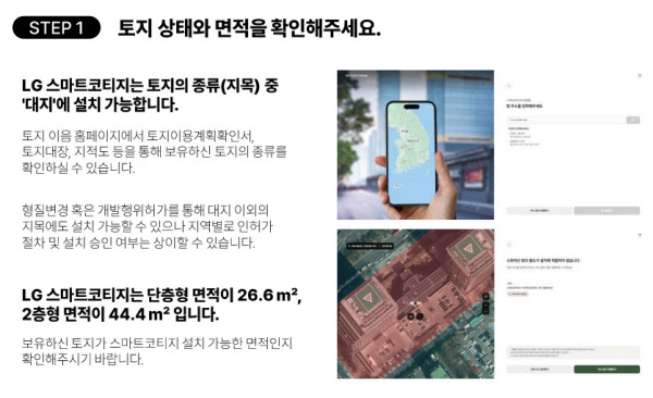 문제는 아무나 ‘스마트코티지’를 살 수는 없다는 것. 조립식 주택을 설치할 수 있을 만한 땅을 가진 사람이어야 가능하다. 그렇다고 아무 땅에나 설치 가능한 것은 아니다. 토지 지목은 ‘대지’여야 하며 단층형을 원하는 경우 적어도 26.6㎡, 2층형은 44.4㎡ 규모를 확보해야 한다. 주택을 배송할 때 LG전자가 트럭과 트레일러를 쓰기 때문에 현장 진입을 위해 땅이 폭 4m 이상의 도로를 4m 이상 접해있어야 하고, 인근 전신주 높이가 6m 이상은 되어야 하며 큰 나무도 없어야 안전하게 배송 가능하다. 더불어 건축 인허가와 기반 작업을 위한 건축사와 계약도 별도로 맺어야 한다.