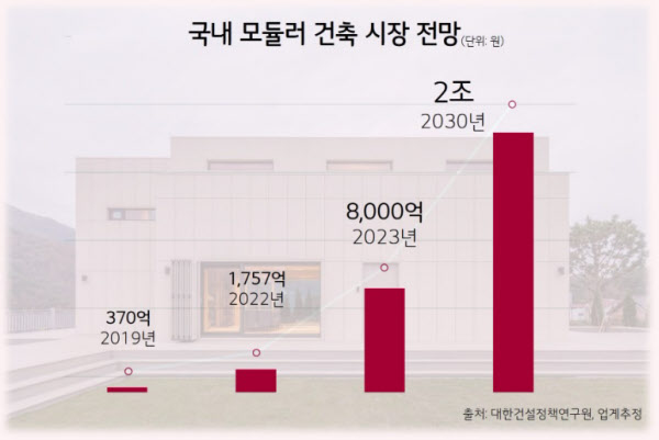 한편 대한건설정책연구원은 2023년까지만 해도 8000억원 규모던 국내 모듈러 건축 시장이 2030년까지 2조원 수준으로 커질 것이라는 전망을 내놨다. 글로벌 시장조사기관 마켓앤마켓 역시 전 세계 모듈러 건축 시장 규모가 2024년 1041억달러(약 145조원)에서 2029년이면 1408억달러(약 197조원)까지 확대될 것으로 내다보고 있다. /leejin0506@chosun.com