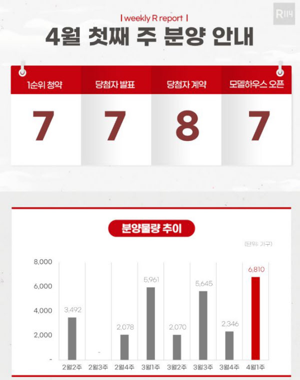 29일 부동산R114에 따르면, 내주인 4월 첫째주 전국에서 6810가구가 분양을 시작한다. 이 중 일반분양 물량은 3784가구다. 서울 영등포구 신길동 ‘더샵신길센트럴시티’, 서울 서초구 서초동 ‘아크로드서초’, 충남 천안시 탕정면 ‘아산탕정자이메트로시티’ 등이 전국 7개 단지가 청약을 진행한다.