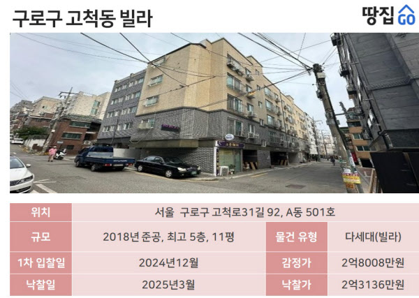 29일 땅집고옥션(☞바로가기)에 따르면 해당 물건은 구로구 고척로31길 92 수명그린빌 5층, 전용면적 약 37㎡(약 11평)다. 사건번호는 2024타경126007이다.