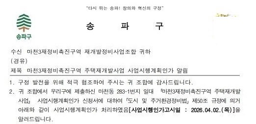 1일 재개발 업계에 따르면 송파구청은 지난달 31일 마천3재정비촉진구역(이하 마천3구역) 재개발정비사업조합에 ‘마천3구역 주택재개발사업 사업시행계획인가 알림’ 공문을 보냈다. 구청은 “조합에서 구청에 제출한 마천동 283-1번지 일대 마천3구역 재개발 사업시행계획인가 신청서에 대해 도시 및 주거환경정비법(도정법) 제50조 규정에 의거, 오는 2일 사업시행인가를 고시한다”고 밝혔다.