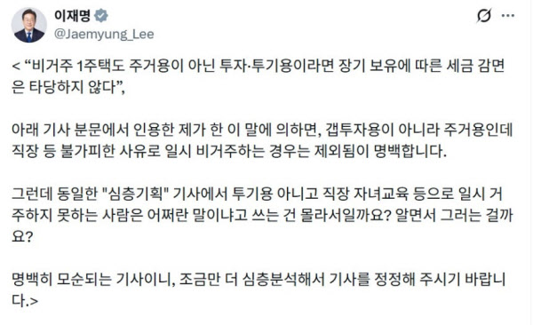 이 대통령은 해당 기사를 공유하며 “갭투자용이 아니라 주거용임에도 불가피하게 일시 비거주하는 경우는 장특공제 비적용 대상에서 제외됨이 명백하다”고 밝혔다. 이어 “같은 기사에서 투기 목적이 아닌 일시적 비거주자는 어떻게 하느냐고 묻는 것은 모순”이라며 정정을 요구했다.