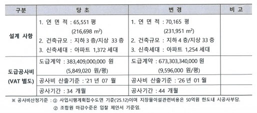 현대건설은 공사 기간 역시 기존 34개월에서 44개월로 10개월 연장을 요청했다. 지하 층수가 기존 지하 3층에서 지하 4층으로 깊어지는 등 설계 변경 사항을 반영한 결과로 풀이된다. 공사비 산출 기준 시점은 2021년 7월에서 2026년 1월로 변경됐다. 지난 수년간 이어진 원자재 가격 상승과 인건비 폭등 등 고물가 상황이 고스란히 반영된 결과로 풀이된다.
