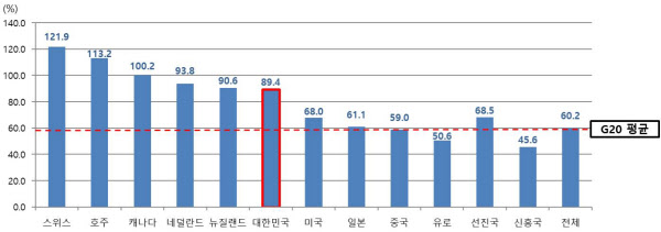 작년 말기준으로 88.6%(잠정) 수준인데, 미국(68%), 일본(61.1%), 중국(59%) 대비 높다. 주요국 대비 높은 편이지만, 최근 가계부채 관리는 준수하게 이뤄졌다는 평가가 나온다. 코로나19 팬데믹 무렵인 2021년 98.7%까지 치솟았지만, 점진적으로 감소해 2024년 80%대 후반으로 감소했다.
