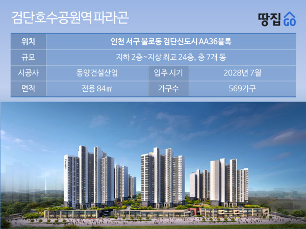 인천 서구 불로동 일대 검단신도시 AA36블록에 들어서는 이 단지는 지하 2층~지상 최고 24층, 7개동, 전용면적 84㎡ 단일 평형 총 569가구 규모로 조성된다. 전 가구가 일반분양 물량으로 나온다. 84㎡A 297가구, 84㎡B 272가구로 구성된다. 청약 일정은 4월 6일 특별공급을 시작으로 7일 1순위, 8일 2순위 접수를 진행하며, 입주는 2028년 7월 예정이다.