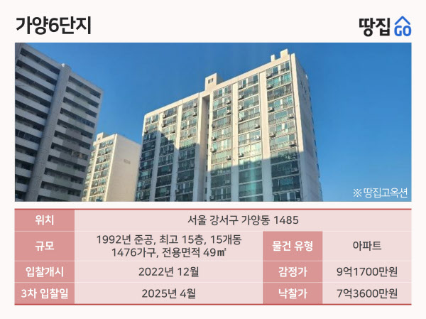 3일 땅집고옥션(☞바로가기)에 따르면, 해당 물건은 강서구 가양동 1485 ‘가양6단지’ 아파트 610동 12층, 전용면적 49㎡(19평형)이다. 사건번호는 2022타경6086이다. 가양6단지는 1992년 준공한 지상 15층 15개동 1476가구다. 해당 물건은 침실 2개, 거실, 욕실 등을 갖춰 2~3인 가구가 살기에 적합하다.