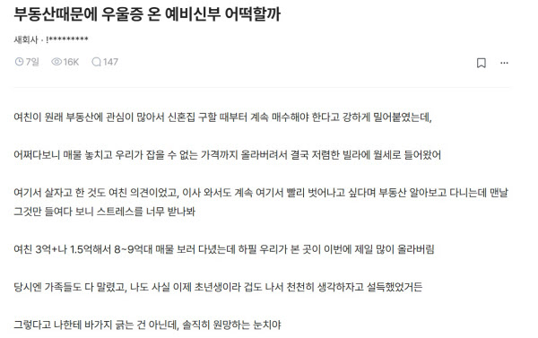 최근 직장인 온라인 커뮤니티에서 결혼을 앞둔 한 남성이 부동산 때문에 예비신부를 우울하게 만들었다고 고백한 글이 화제를 모으고 있다. 신혼집을 매수하는 문제를 두고 두 사람 간 의견이 갈렸는데, 갈팡질팡하던 남성 때문에 저렴한 빌라 월세로 신혼 생활이 시작되면서 예비신부가 절망에 빠졌다는 것.