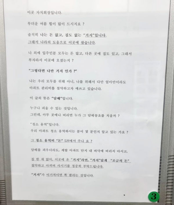 A씨가 말하고 싶은 본론은 ‘담배꽁초 무단 투기’였다. 그는 “누구나 (담배를) 피울 수는 있는 것”이라면서도 “그런데 아무 곳에나 버리면 누가 그 담배꽁초를 치우느냐, 청소 용역이다. 청소 용역비는 LH에서 주느냐”고 지적했다. 그는 “담배를 피우더라도 제발 아파트 단지 내 바닥에 버리지 마시고, 집 한 채 없이 이곳에 온 거지라면 거지답게, 조금의 돈도 절약하고 아끼며 사시기를 정중히 부탁드린다”고 했다. 끝으로 “거지가 이기적이면 쪽 팔리는 것”이라고 강조했다.