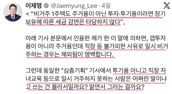 그는 “현직 대통령 역시 인천 계양을에 출마하기 위해 약 4년간 자신의 분당 집을 두고 계양에 전세를 얻어 살았던 시절이 있었다. 그 역시 당시에는 거주와 생존, 그리고 목적을 위해 주거 형태를 바꾼 '실수요자'였을 것”이라며 이재명 대통령의 이중잣대를 비판했다. 이어 “이처럼 주거는 삶의 중요한 순간에 따라 유연하게 변화시킬 수 있는 권리이다. 그런데 투기를 잡겠다는 명분이 실수요의 이동까지 막기 시작하면, 그 때부턴 더 이상 국가 정책이 아니라 ‘거주 이전의 자유’에 대한 도전이자 침해가 될 수 있다”는 지적으로 글을 마쳤다.