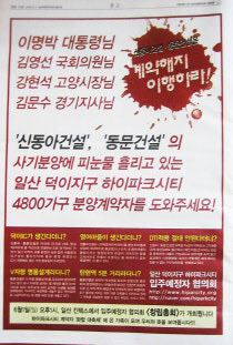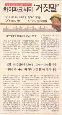 이런 가운데 ‘하이파크시티’가 과대 광고로 수분양자를 기만했다는 불만까지 터지면서 사업이 난항을 겪었다. 2007년 말 분양하며 각종 광고·홍보물에 ▲2010년 덕이IC 2010년 완공 ▲단지 내 영어마을 건립 ▲V자형 설계로 조망권 확보 등을 내세웠지만 실상은 전혀 달랐다는 주장이 쏟아져나온 것.