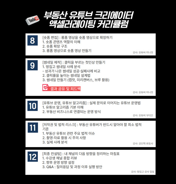 이번 과정의 핵심은 명확하다. 수강생을 유튜브 채널 운영자가 아니라 실제 수익을 창출하고 영향력을 확대할 수 있는 ‘부동산 전문가’로 만들어 내는 것. 이를 위해 교육 기간에 콘텐츠 기획부터 촬영·편집, 브랜딩 전략까지 전 과정을 밀착 코칭하고, 결과물까지 직접 만들도록 설계했다. 수강 대상은 유튜브 채널을 개설했거나 운영 경험이 있는 부동산 업계 종사자다. 공인중개사, 시행·시공사 관계자, 자산관리·투자 컨설팅 종사자 등으로 유튜브를 활용해 전문성을 확장하고 수익 구조를 만들 수 있도록 설계했다.