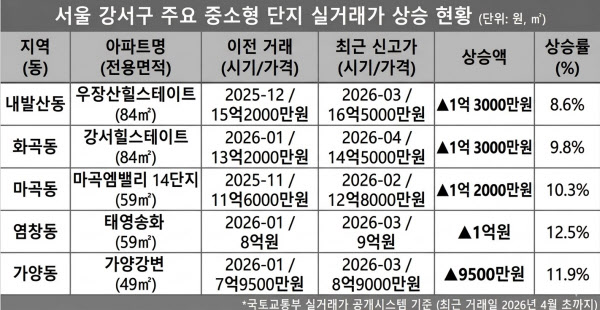 전용 60㎡ 이하 소형 아파트 거래도 활발하다. 강서구 신고가 거래 가운데 전용 60㎡ 이하 주택이 51건을 차지했다. 마곡동 ‘마곡엠밸리14단지’ 59㎡는 지난해 11월 11억 6000만원에서 올해 2월 12억8000만원으로 1억2000만원 상승했다. 가양동 ‘가양강변’ 49㎡는 올해 1월 7억 9500만원에서 3월 8억 9000만원으로 오르며 신고가를 기록했다. 염창동 ‘태영송화’ 59㎡ 역시 1월 8억원에서 3월 9억원으로 2개월 만에 1억원 상승했다.