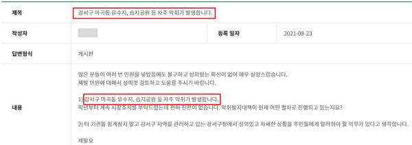 그러나 수년째 뚜렷한 문제 해결책은 나오지 않고 있다. 서울 강서구청 ‘구청장에게 바란다’는 게시판에는 강서구 일대 악취와 관련한 민원요청이 10건 이상 올라와 있다. 지난 2021년 ‘강서구 마곡동 유수지, 습지공원 등 자주 악취가 발생합니다’라는 제목의 민원 글에서 작성자 송모씨는 “강서구 마곡동 유수지, 습지공원 등 자주 악취가 발생한다”며, “작년부터 계속 시장조치를 부탁드렸는데 전혀 진전이 없다”라며 시급한 대안마련을 촉구한 바 있다. 이후로도 매년 강서구 악취와 관련 민원 요청글이 올라오고 있다.
