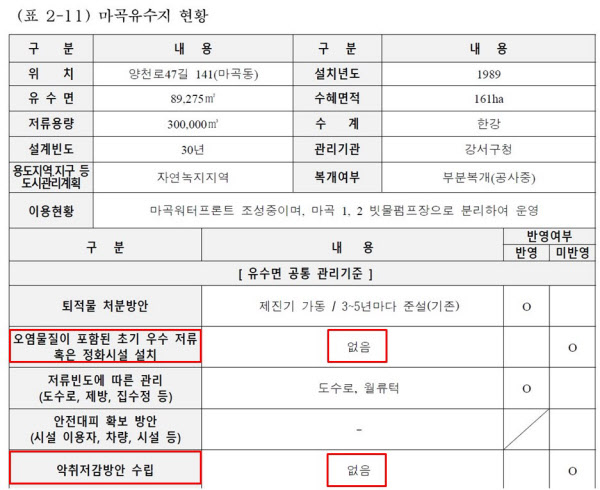 더 큰 문제는 구조적 관리 부재다. 지난 2024년 서울시가 발간한 ‘유수지 복합개발방안’ 학술용역 보고서에 따르면, 서울시에는 총 52개의 유수지가 있다. 이 중 악취문제로 거론되는 몇 유수지 중 강서구 마곡동 406-1일대 유수지가 포함된다. 과연 악취저감시설이 설치되어 있었을까. 발간 당시 기준 3년전부터 주민들로부터 민원이 쇄도하는 등 문제가 거론됐음에도, 현재까지 악취저감시설도 없고 악취저감방안 수립 조차 없는 것으로 확인됐다.