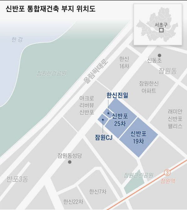 한편 신반포19ㆍ25차를 비롯해 한신진일빌라트와 잠원CJ빌리지 등 4개 단지를 통합해, 지하 4층~지상 최고 49층 아파트 7개동 614가구와 부대복리시설을 짓는 사업이다. 예정 공사비는 약 4434억원으로, 3.3㎡(1평)당 공사비는 1010만원 수준이다. / pkram@chosun.com