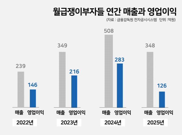 10일 금융감독원 전자공시시스템에 따르면, 월급쟁이부자들은 지난해 별도 기준 매출 348억원, 영업이익 126억원을 기록했다. 영업이익률은 약 36%로 높은 수준을 유지했고, 2018년 설립 이후 32개 분기 연속 흑자를 이어갔다. 연평균 매출 성장률(CAGR)도 71%에 달한다.