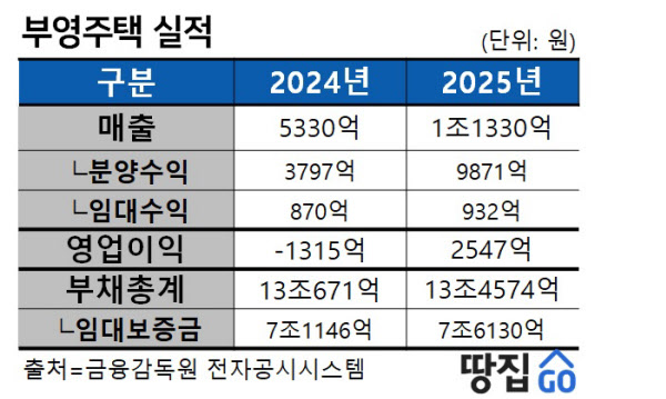 13일 금융감독원 전자공시시스템에 따르면 지난해 부영주택의 매출은 1조1330억원으로 나타났다. 2024년 5330억원에서 1년 만에 112% 폭증한 수치다. 이에 따라 전년 1315억원의 영업손실을 기록했던 부영주택은 당기 영업이익 2547억원을 기록하며 단숨에 흑자 전환에 성공했다.