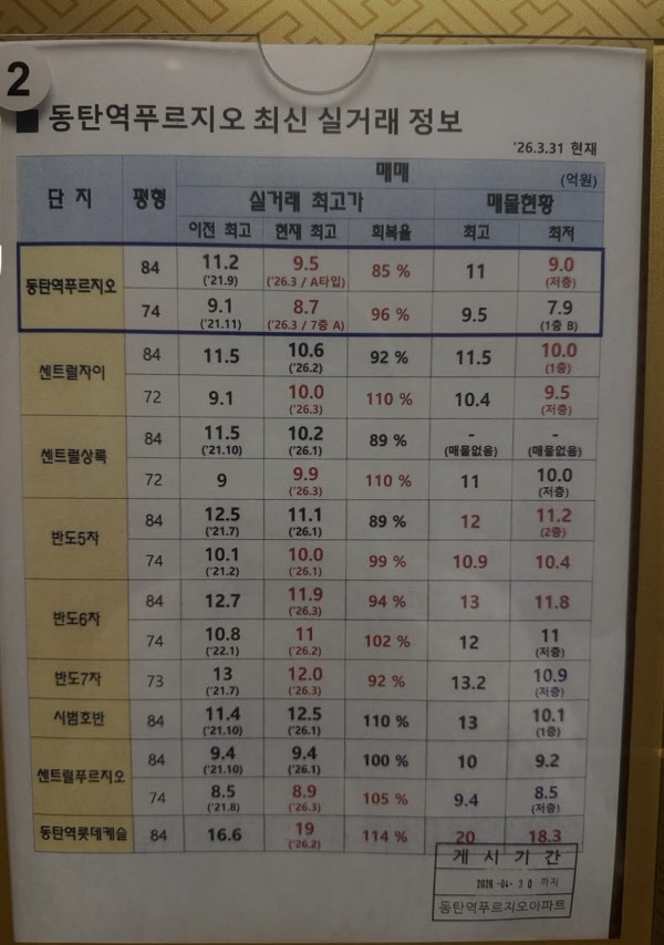 이 안내문은 ‘동탄역푸르지오’를 비롯한 동탄신도시 일대 아파트 9곳 단지명을 언급하며, 주택형별로 ▲이전 최고가 ▲현재 최고가 ▲ (집값) 회복률 ▲매물 호가 현황 등 가격을 올해 3월 31일 기준으로 정리한 표를 보여주고 있다.
