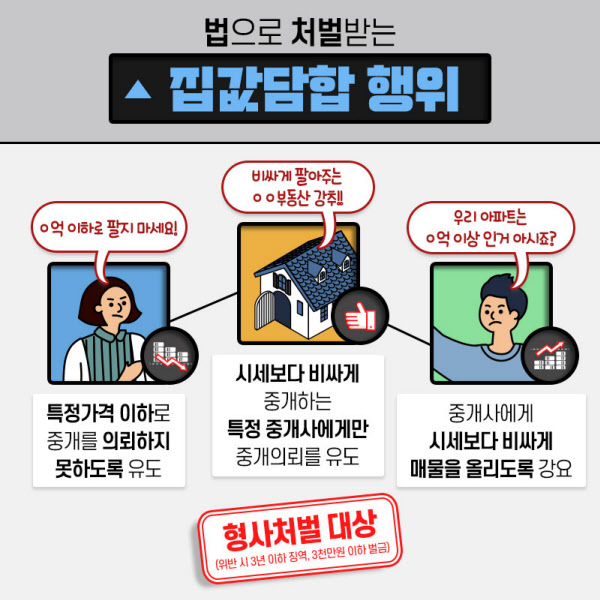 그동안은 집주인들의 집값 담합 행위가 포착되더라도 법적 처벌을 내리는 사례가 드물었다. 현행 공인중개사법이 안내문·온라인 커뮤니티 등을 활용해 기준점보다 낮은 가격일 경우 중개를 의뢰하지 않도록 유도하는 행위를 금지하고 있긴 하지만, 이는 집주인이 아니라 중개업자가 가격 담합을 유도하는 경우에 한정했기 때문이다. 더군다나 부동산거래신고법도 허위 신고 등에 대한 처벌을 규정하는 반면, 집값 정보를 게시하는 행위를 제재하지는 않았다.