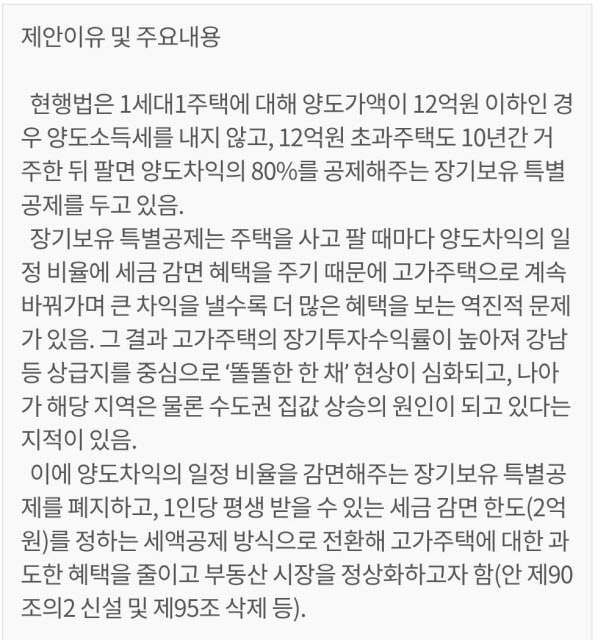현행 제도는 1세대 1주택자의 경우 양도가액 12억원 이하(2년 이상 거주 시)에는 양도세가 전액 면제되고, 12억원을 초과하더라도 10년 이상 보유·거주하면 양도차익의 최대 80%를 공제해준다. 장기 보유를 유도하고 실수요자를 보호하기 위한 장치지만, 여권을 중심으로 최근 집값 상승으로 고가 주택 보유자에게 과도한 혜택이 집중된다는 비판이 제기돼 왔다.