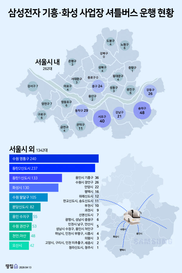 15일 업계와 삼성전자 등에 따르면, 화성·기흥 캠퍼스를 오가는 셔틀버스는 총 1600대가 넘는다. 수도권에만 1342대가 투입되며, 서울 시내에도 약 262대가 운영 중이다. 주목할 점은 서울 내 자치구 중 송파구의 운행 대수다. 송파구는 총 48대로 강남구(21대)보다 두 배 이상 많다. 김 씨는 “한강 이북으로 가면 심리적 부담이 커져 사내 직원들이 선호하지 않는다”며 “동남권 중에서도 대단지 주거지가 몰린 잠실역부터 가락동, 문정동 등 송파대로 라인에 거주하는 이들이 많다”고 했다.