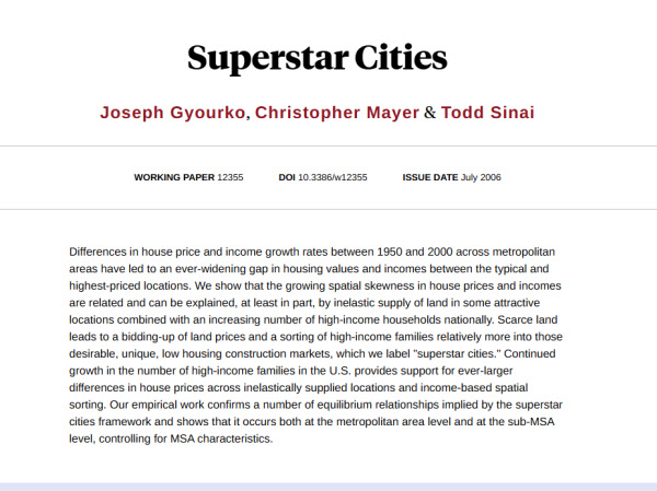 특정 도시의 주택에 수요가 몰려 집값이 비싼 것은 글로벌 도시의 공통적인 현상이다. 와튼 스쿨의 조셉 지오코 교수 등은 2006년 논문 〈Superstar Cities〉를 통해 이 현상을 해명했다. 소득 수준이 높은 '슈퍼 부자'들이 늘어나면서, 이들이 살고 싶어 하는 매력적인 도시(뉴욕, 런던, 샌프란시스코, 서울 등)에 대한 수요가 폭증하지만 이들 도시는 이미 가용 토지가 부족하거나, 강력한 건축 규제(Zoning) 때문에 주택 공급이 매우 제한적이다.