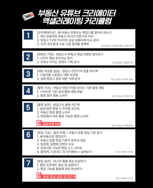이번 과정은 오는 5월 19일부터 6주간 진행한다. 콘텐츠 기획부터 촬영·편집, 브랜딩 전략까지 전 과정을 밀착 코칭하고, 결과물까지 직접 만들도록 설계했다. 수강 대상은 유튜브 채널을 개설했거나 운영 경험이 있는 부동산 업계 종사자다.