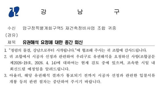 강남구청, 사실상 ‘입찰 중단’ 통보… 유권해석 결과 따라 판도 급변