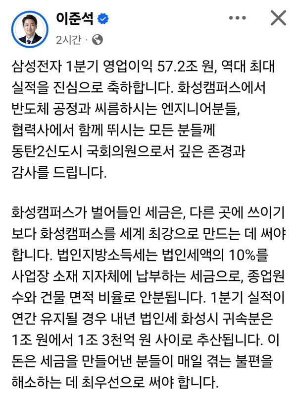 정치권에서는 삼성전자 화성캠퍼스 실적을 바탕으로 화성시 귀속 지방세가 1조원을 넘을 것이라는 전망이 나온다. 다만 이는 추정치로 투자 세액공제나 사업장 간 안분 비율에 따라 실제 규모는 달라질 수 있다. 이준석 개혁신당 대표(화성시을)는 “화성캠퍼스에서 발생하는 지방세는 지역 인프라 확충에 우선 투입해야 한다”고 주장했다. 그는 “법인지방소득세는 사업장 소재 지자체에 납부되는 만큼, 세금을 만들어낸 지역 주민의 불편을 해소하는 데 쓰여야 한다”며 동탄트램 사업을 대표적인 활용 방안으로 제시했다. 이어 “1조원대 세수라면 트램 사업은 충분히 해결 가능한 규모”라며 “버스 노선 확충 등 교통 인프라 개선도 병행해야 한다”고 강조했다.