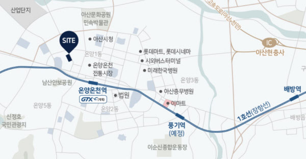 분양 홈페이지에선 수도권광역급행철도(GTX) C 노선 연장 계획을 교통 호재로 설명하고 있다. 당초 GTX-C 노선이 경기 양주 덕정부터 수원까지 잇는 노선으로 계획됐는데, 현재 단지가 있는 아산시까지 연장하는 방안이 논의 단계에 있다는 것. 다만 노선이 개통하더라도 온양온천역과 직접 연결되는 구조는 아닐 것으로 예상된다. 가장 유력한 정차역으로 세 정거장 떨어져 있는 아산역 인근 천안아산역이 거론되고 있어서다.