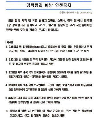한국 대사관에 따르면, 한국인이 주로 찾는 짐바란, 스미냑, 짱구 등 주요 관광지에서 강력 사건이 연이어 발생하고 있다. 지난 2월 짐바란에서는 우크라이나 남성이 납치된 뒤 열흘 만에 토막 난 시신으로 발견됐고, 3월에는 네덜란드 관광객 피습 사망 사건과 중국인 여성 성폭행 사건이 같은 날 발생했다. 대사관은 이례적으로 구체적인 지역명까지 공개하며 경고했다. 사건 발생한 곳이 숙소, 식당, 해변 등 관광객이 밀집한 장소라는 점은 불안감을 더욱 키운다. 대사관측은 야간에 나홀로 통행을 자제하고 신원이 불확실한 오토바이 택시(고젝, 그랩 등) 이용에 주의해야 한다고 밝혔다. 빌라를 숙소로 사용할 경우, 보안을 확인해야 한다. 개정 형법에 따라 인도네시아에서는 혼전 동거 및 성관계가 처벌 대상이 될 수 있다.