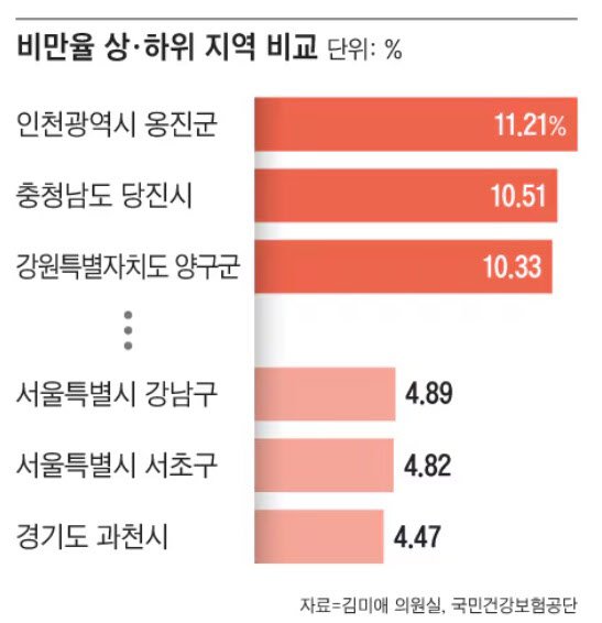 반대로 전국 최저 비만율 지역은 경기 과천시(4.47%)였다. 인천 옹진구의 비만율이 과천시보다 2.5배나 높은 셈이다. 과천시에 이어 서울 강남구(4.9%), 송파구(5.7%), 용산구(5.8%), 성남시 분당구(5.1%), 용인시 수지구(5.4%) 등 대체로 소득 수준이 높은 만큼 집값이 높은 수도권 지역들이 이름을 올렸다.