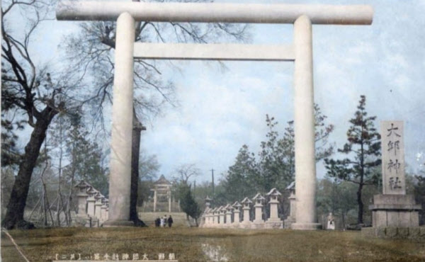 이렇게 청일전쟁에서 압도적으로 승리한 일본은 자축 기념으로 1906년 대구 달성토성에 ‘대구신사’를 세웠다. 석재 기둥 두 개를 수직으로 세우고, 이 기둥을 가로 두 줄로 연결해 마치 출입문처럼 만든 ‘토리이’ 모형이 핵심 시설이다. 일본 신화에 등장하는 태양신이자 최고 권위를 갖는 아마테라스를 섬기는 신사로 자리잡았다. 당시 대구사람들이 신성하게 여기던 달성토성 한복판에 딱 봐도 왜색이 짙은 대형 조형물이 들어서면서 대구지역 국민들에게 좌절감을 줬다.