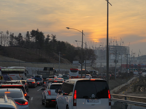 [땅집고] 17일 오전 7시, 세종포천고속도로 남용인IC를 빠져나와 용인 원삼면 SK하이닉스 반도체클러스터로 향했다. 톨게이트를 빠져나와 제1 주차장 진입로로 가는 길은 이른 아침부터 거대한 주차장을 방불케 했다. 출근 시간 도심 한복판을 옮겨놓은 듯했다. 승용차와 전세버스가 뒤엉켜 어림잡아 1km 넘게 꼬리를 물었다. 공사장 주변에 머물 곳을 구하지 못한 인력들이 평택·수원·안성 등에서 몰려들었다. 주차장 수용 규모는 970여 대에 그쳐 통근 인구에 비해 턱없이 부족하다.