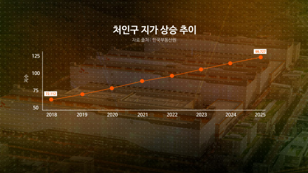 지역 중개업소에선 “지붕만 덮여 있으면 방이 나간다”는 말이 공공연한 사실로 통한다. 개발 전 평당 40만~50만원이던 땅값은 500만원을 돌파했고, 중심 상업지는 2000만원을 호가하며 7년 새 10배 이상 폭등했다. 처인구 일대 지가 지수 또한 개발 지정 전과 비교해 크게 올랐다. 한국부동산원 자료에 따르면 2018년 72.11로 집계됐던 처인구 지가 지수는 2025년 99.72까지 뛰어 38% 오른 것으로 나타났다.