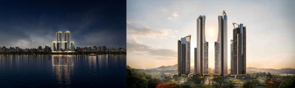 설계안에서는 하이엔드 자부심 대결이 치열하다. 두 시공사 모두 조합원 전 가구 100% 한강 조망을 전면에 내세웠다.
