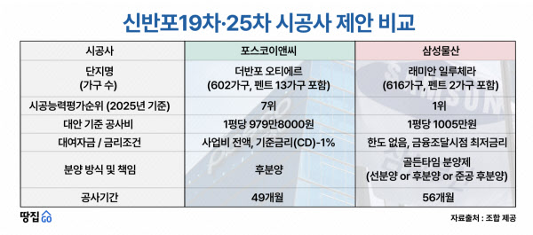 [땅집고] 서울 서초구 잠원동의 알짜배기 재건축 단지인 ‘신반포 19·25차’ 통합재건축 수주를 두고 삼성물산과 포스코이앤씨가 맞붙었다. 양 사가 제출한 사업제안서가 공개된 가운데 국내 시공능력평가 1위인 삼성물산은 압도적인 자금력을, 포스코이앤씨는 파격적인 금융 혜택과 속도를 앞세워 조합원 표심 잡기에 나섰다. 핵심 쟁점 3가지를 짚어봤다.