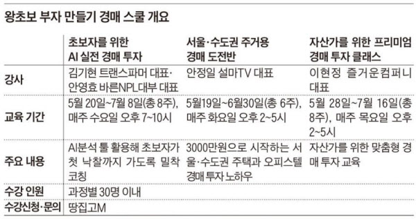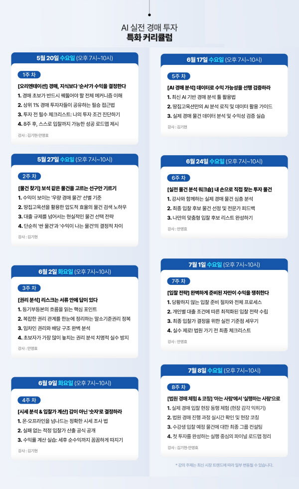 3개 과정을 운영한다. ‘AI 실전 경매 투자’ 과정은 AI를 활용한 기초 다지기 강의다. 물건 분석부터 수익 구조, 입찰 전략 등 경매 순서와 기준을 알려준다. 소액 투자자를 위해 ‘서울·수도권 주거용 경매 도전반’도 준비했다. 3000만원으로 가능한 아파트·빌라·오피스텔 경매 투자 비법을 전수한다. 여윳돈이 있다면 ‘자산가를 위한 프리미엄 경매 투자’가 적합하다. 개인별 물건 피드백과 일대일 상담을 진행한다.
