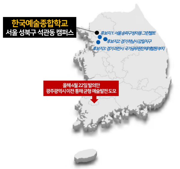 한예종은 1993년 서울에 설립된 국립 특수목적 예술교육기관이다. 현재 음악원·무용원으로 구성하는 서초구 서초동 캠퍼스와, 학교본부 및 연극원·영상원·미술원·전통예술원이 있는 성북구 석관동 캠퍼스로 두 곳으로 나눠져 있다. 이 중 본관격인 석관동 캠퍼스 내부에 자리잡고 있던 조선 왕릉인 ‘의릉’이 2009년 유네스코 세계문화유산에 등재되면서 이전 필요성 목소리가 나오기 시작했다. 세계문화유산 보존과 직결된 사안인 만큼 문화체육관광부와 국가유산청 등 중앙정부 간 협의가 필요하지만, ▲서울 송파구 방이동 ▲경기 하남시 감일지구 ▲경기 과천시 국가공무원인재개발원 과천분원부지 등 수도권 지자체들이 한예종을 유치하려는 움직임을 보여왔다.