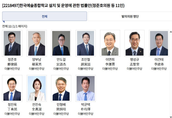 국회 의안정보시스템에 따르면 이달 22일 ‘한국예술종합학교 설치 및 운영에 관한 법률안’이 접수됐다. 더불어민주당 소속인 정준호 의원( 광주 북구 갑)을 대표로 같은 당 소속 의원들 총 11명이 함께 발의한 안건이다.