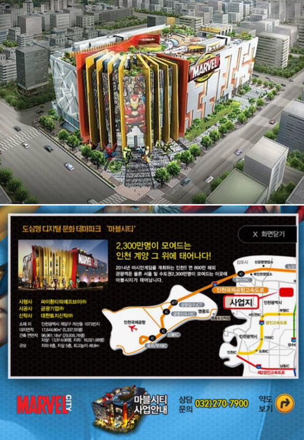 ‘마블테마파크’는 지하 6층~지상 5층, 연면적 총 9만8961㎡ 규모 놀이시설이다. 당시 마블 캐릭터 중 아이언맨 1편 영화가 크게 흥행한 점을 겨냥해, 시행사인 싸이환타엔터테인먼트가 메리츠종합금융·광주은행 등 금융사와 함께 PFV를 설립하고 아시아 최초 마블 관련 테마파크를 계획한 것.