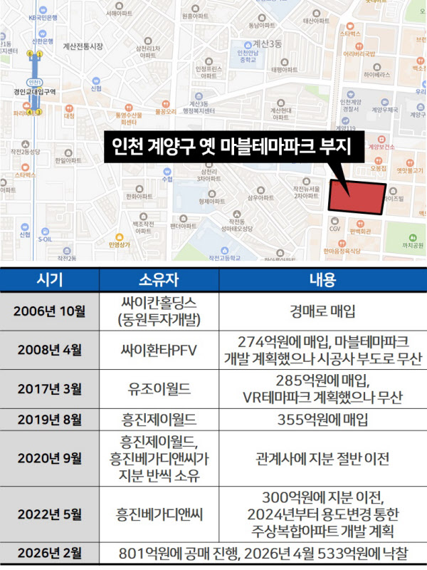 [땅집고] 18년 전 ‘마블테마파크’가 들어설 예정이었지만 공사가 중단돼 도심 흉물로 방치되어 온 인천 계양구 대규모 부지가 공매에서 531억원에 팔렸다. 이 일대 도심에 남은 마지막 알짜 땅이라 앞으로 어떤 시설이 들어설지 주목이 쏠린다.