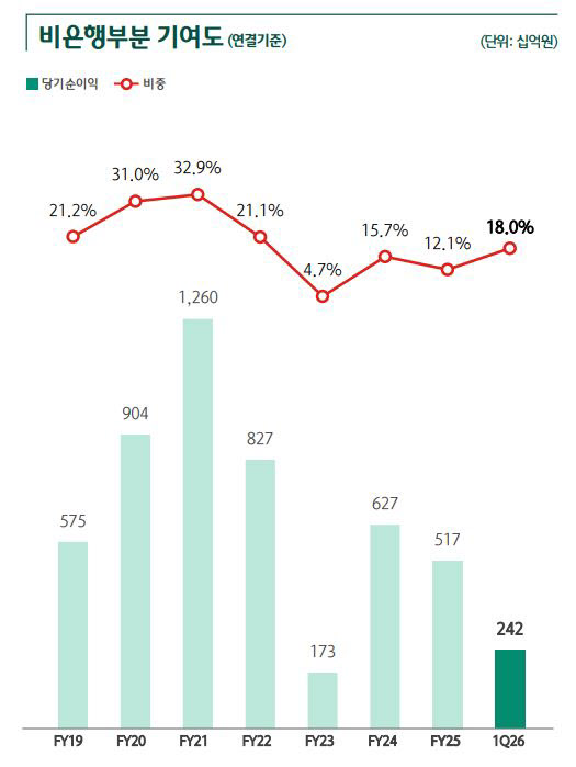 하나금융은 1분기 중 발발한 미국-이란 전쟁 리스크로 인해 주요 금융그룹 중 가장 큰 타격을 봤다. 하나금융은 환율 상승의 영향으로 1분기에만 약 823억원 규모의 일회성 외화환산손실이 발생했다. 하나금융의 외화자산 비중은 총 자산의 약 16%로 5대 금융지주 중 가장 높은 수준이다.