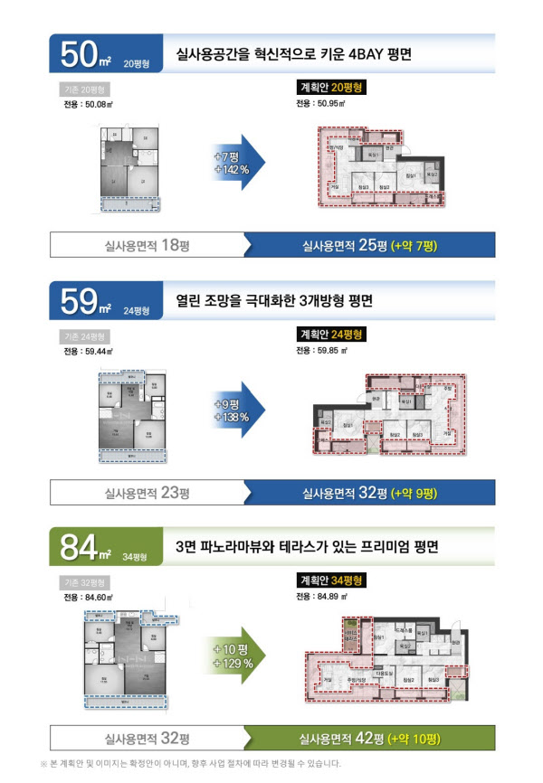 전용면적 84㎡(34평형) 이상부터는 3면 파노라마뷰와 서비스 발코니가 적용된다. 설계안에 따르면, 모든 평형에서 현재 구축 아파트 대비 실사용면적이 7~11평 늘어날 것으로 예상된다.