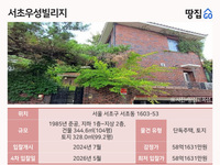 - 서초동 지상 2층 단독주택 58억에 4회차 입찰입지 좋지만 작년에 2회 유찰…권리관계 복잡강남서 대지 100평 경매 물건 드물어 관심 [땅집고] 감정가보다 20억원 가까이..